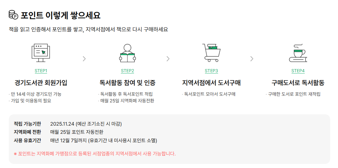 누적된 포인트는 매월 25일 지역화폐로 전환되며, 전환된 지역화폐는 도내 지역서점에서 도서 구매에 사용할 수 있습니다.